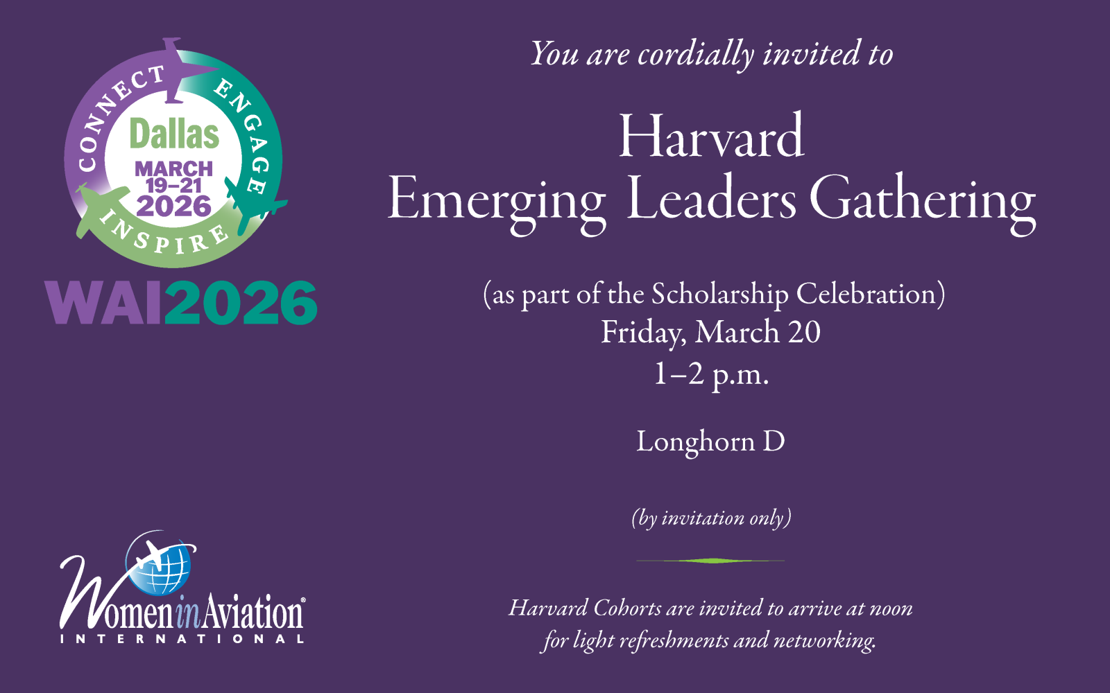 Please join WAI's Board of Directors and leadership at the WAI2026 Scholarship Celebration honoring the incoming 2026 Harvard Emerging Leaders classes and network with WAI Harvard Emerging Leaders classes of 2023, 2024, and 2025.