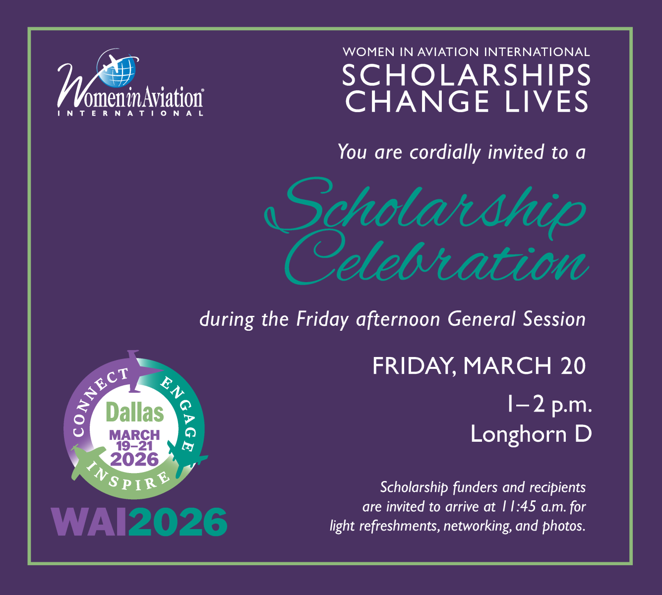 As a scholarship recipient, you and two guests are cordially invited to a special WAI2026 Scholarship Celebration during the 37th Annual Women in Aviation International Conference in Dallas, Texas, March 19-21.