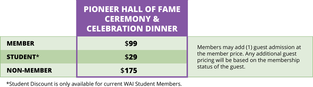 Each year, WAI honor the new inductees into the Pioneer Hall of Fame (PHOF) during this very special event. Join us for our 2026 celebration as we honor our newest members of the PHOF. The evening will include a presentation highlighting the magnificent careers and achievements of these women, a wonderful dinner and entertainment.